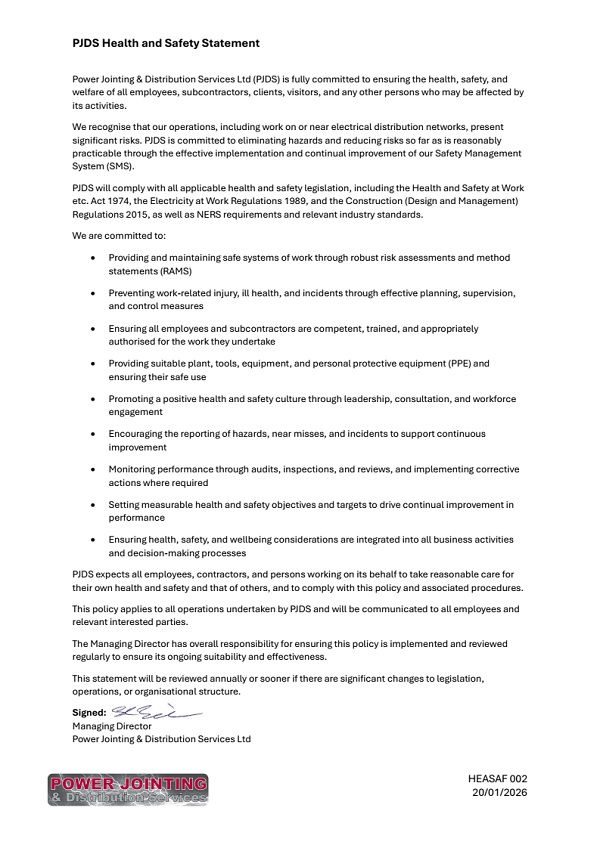 | It is the opinion of the Power Jointing & Distribution Services team that accidents are avoidable. It is our aim, therefore, through the compulsory completion of our unique computer generated, site-specific risk assessments and by following targeted method statements, that a total awareness to safety is maintained. |